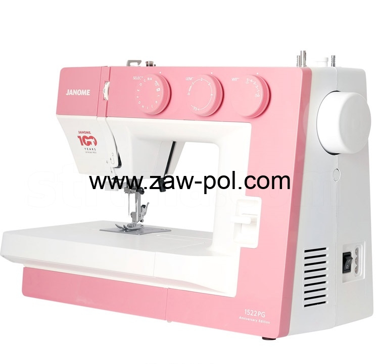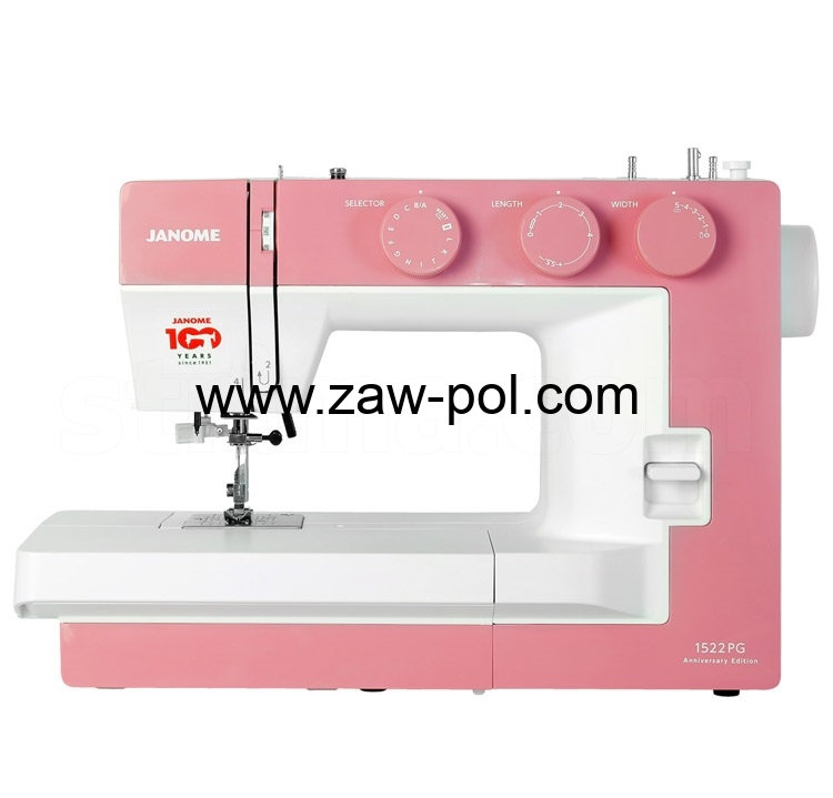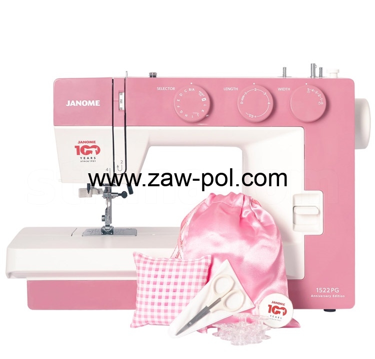 Złoto-różowa maszyna do szycia Janome 1522 to główny, jubileuszowy modelem z tej serii. Do tej maszyny dołączony jest też specjalny jubileuszowy zestaw akcesoriów w różowym woreczku. Zestaw zawiera: małe nożyczki, 10 szpulek, zwijaną miarkę krawiecką i poduszeczkę na szpilki.