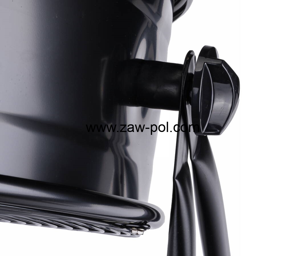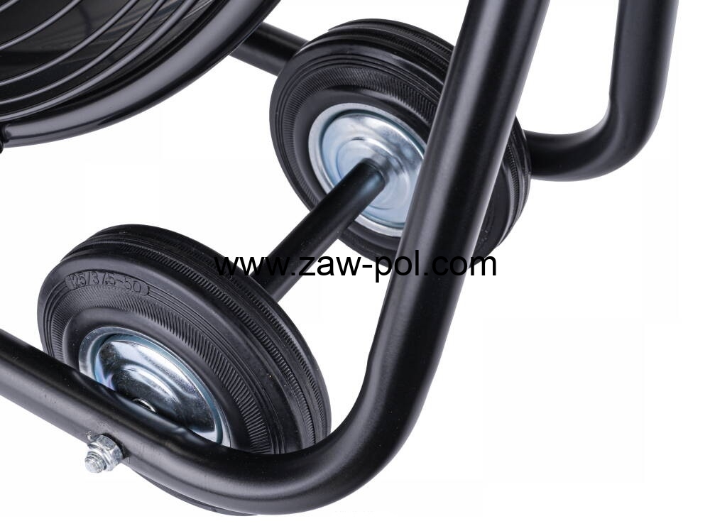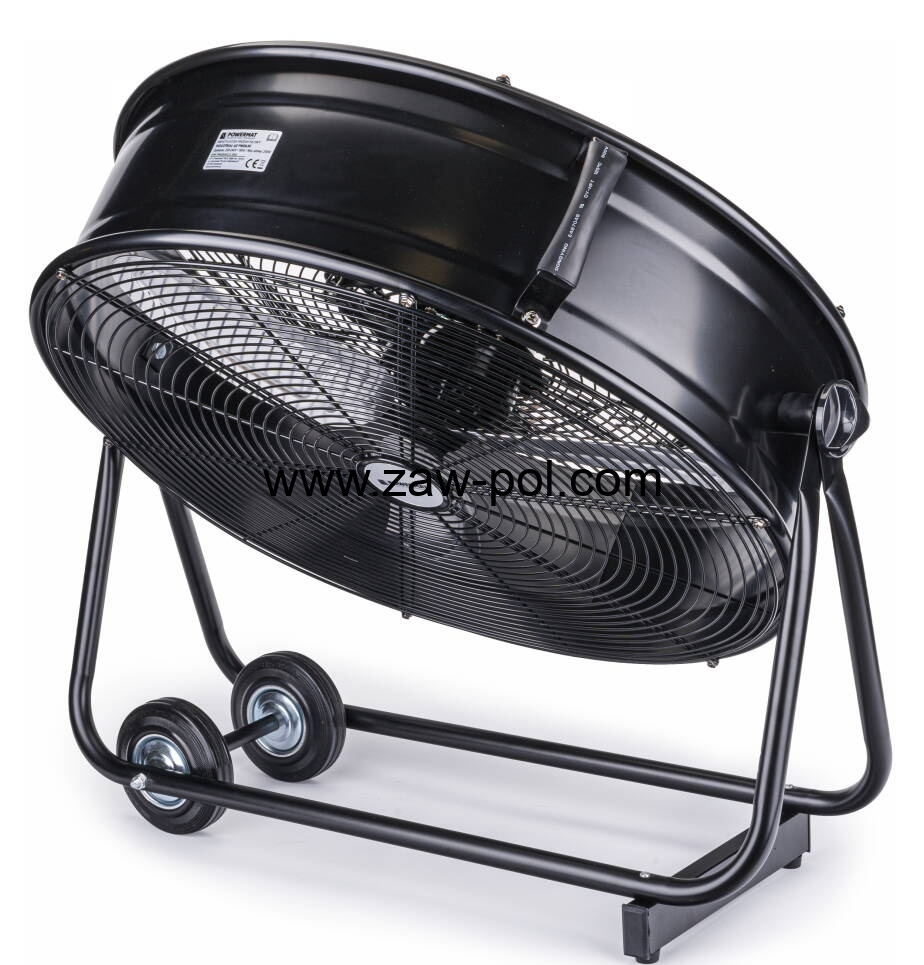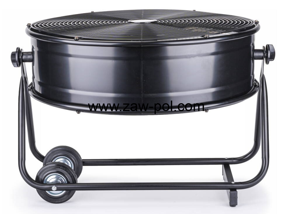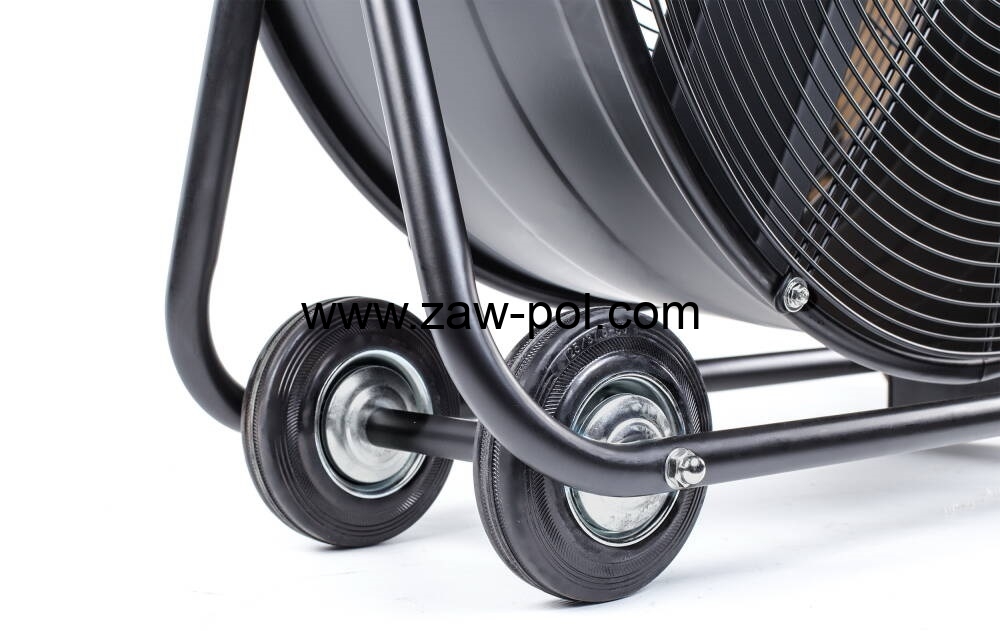 Wentylator ustawiony jest na solidnych podpórkach, które dodatkowo niwelują powstawanie drgań podczas pracy. Aby zwiększyć mobilność, wentylator posiada dwa gumowane koła transportowe oraz uchwyty pomagające w transporcie.