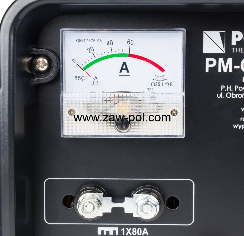 Prostownik posiada analogowy amperomierz dwa przyłącza prądowe PLUS 12v i 24v, bezpiecznik 80A oraz przewód minusowy zamontowany na stałe.