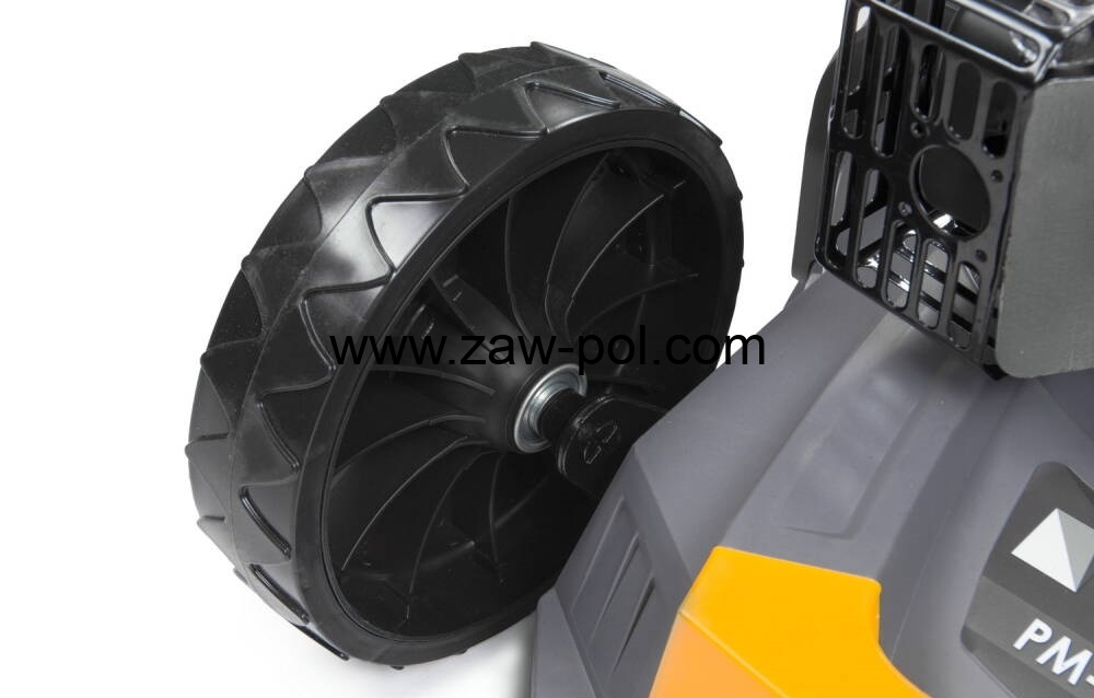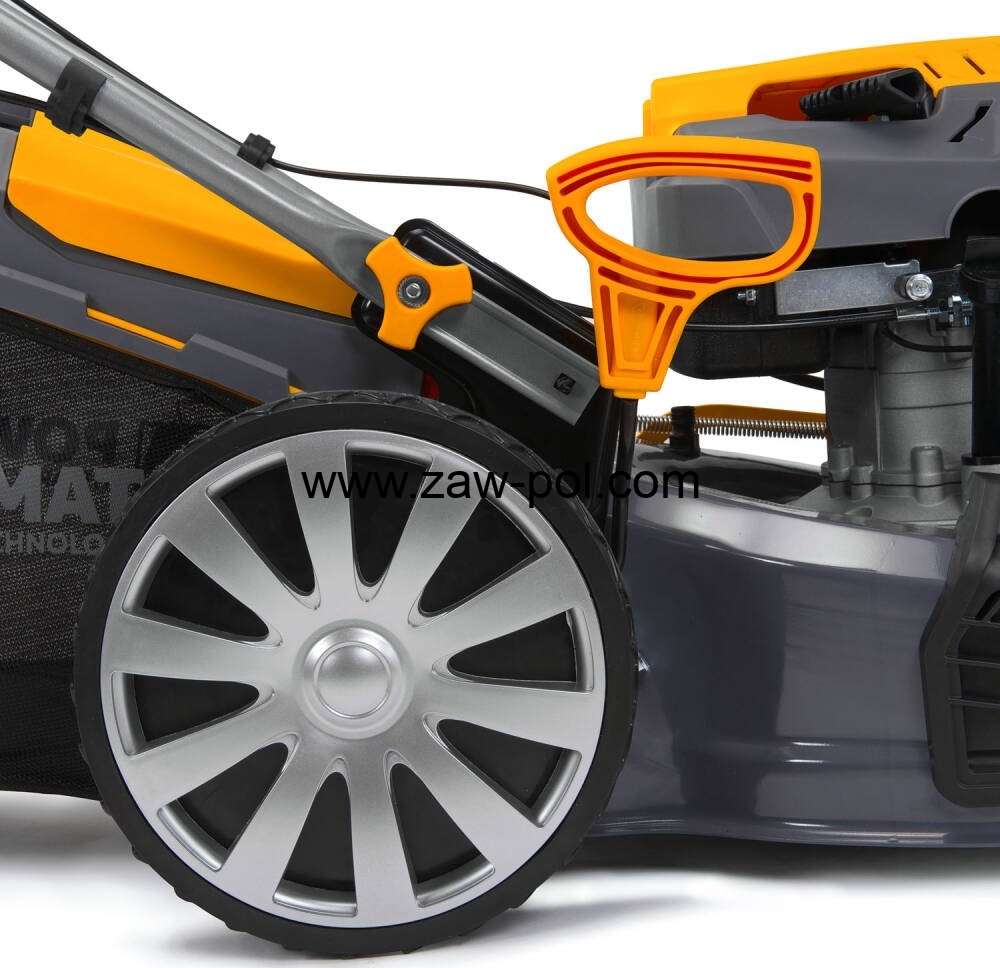 Funkcja napędu samobieżnego zapewnia większy komfort pracy. Pchanie urządzenia przez gęsta trawę lub po pochyłym terenie nie wymaga wysiłku, gdyż do poruszania kosiarki wykorzystywany jest jej własny napęd.
