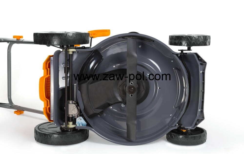 Noże tnące kosiarki są wykonane z hartowanej stali, co zapewnia długą żywotność ostrza. Szerokość koszenia kosiarki to aż 510mm co pozwala na komfortową pracę na dużych powierzchniach. Mocowanie ostrza wraz z wytrzymałą śrubą daje wyjątkową wytrzymałość zespołu tnącego.