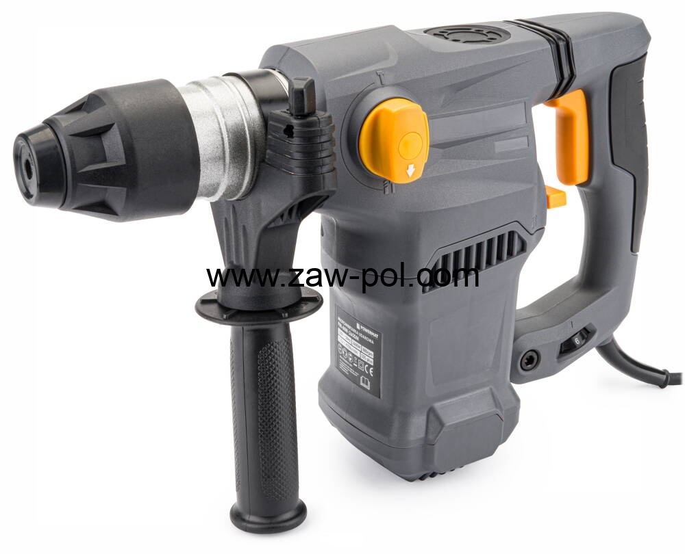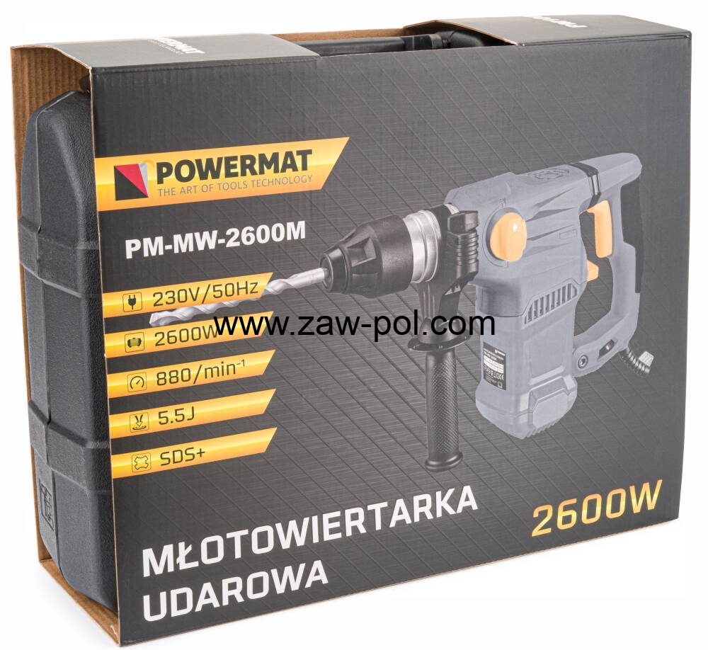 Kompaktowa młotowiertarka POWERMAT napędzana szczotkowym silnikiem o mocy 2600W.