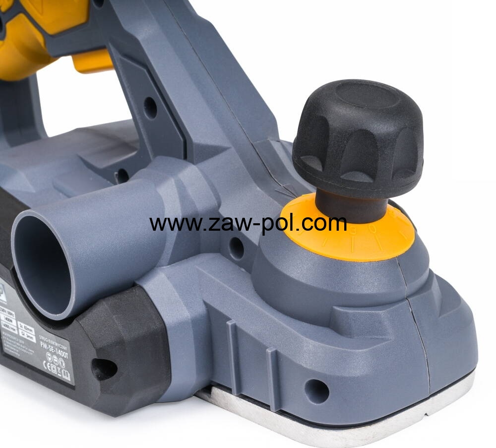 Heblarka wyposażona jest w regulację strugania głębokości od 0-3mm. Regulacja znajduje się zaraz pod uchwytem prowadzącym i regulowana jest za pomocą gałki obrotowej.