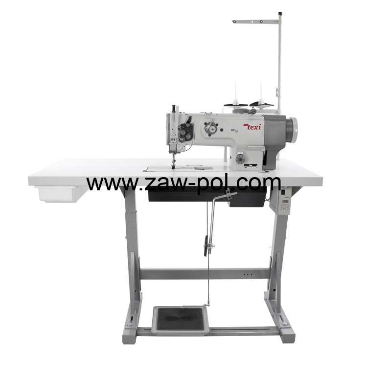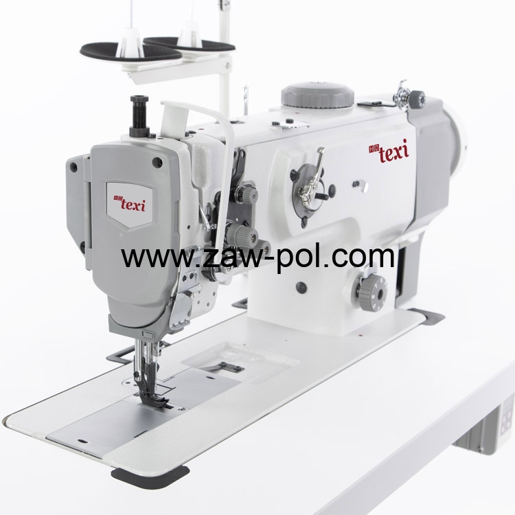 Stebnówka 1-igłowa z potrójnym transportem, dużym chwytaczem i regulacją wysokości naprzemiennego kroczenia stopek. Wyposażona w energooszczędny silnik AC Servo.
