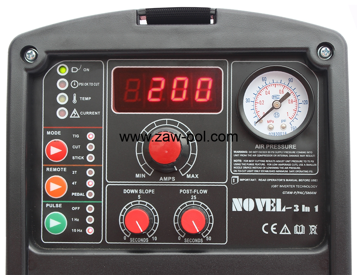 NOVEL 3w1 to urządzenie dla użytkowników szukających możliwości wielu zastosowań i niewielkich gabarytów połączonych z atrakcyjną ceną. Panel pozwala na dobranie parametrów dopasowanych do indywidualnych potrzeb. Za pomocą przycisku przełącza się pomiędzy trybami pracy urządzenia, czyli spawaniem metodą TIG, cięciem plazmowym oraz spawaniem metodą MMA.